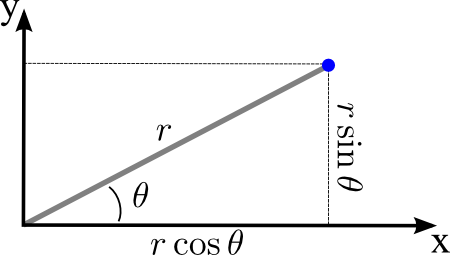 \[\begin{aligned} I^2 &= \bigg(\int_{\mathbb{R}} e^{-x^2} \, dx \bigg)^2 \\\ &= \bigg(\int_{-\infty}^{\infty} e^{-x^2} \, dx\bigg)\bigg(\int_{-\infty}^{\infty} e^{-y^2} \, dy\bigg) \\\ &= \iint\limits_{\mathbb{R}^2} e^{-(x^2 + y^2)} \, dx\,dy \end{aligned}\]Since this integral is over the entirety of $\mathbb{R}^2$, we can alternatively parameterize the integral over the polar coordinates $r$ and $\theta$. The relationships between the variables are shown below.
