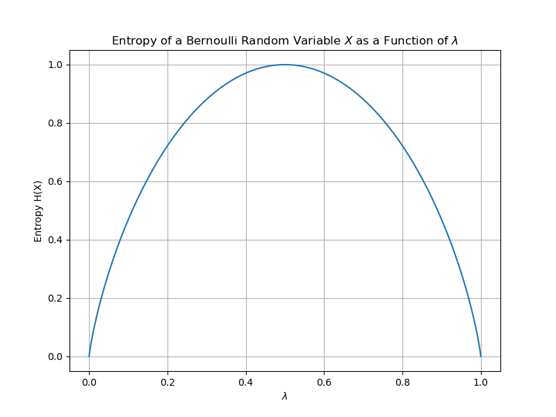 \[\begin{aligned} p(x) = {\displaystyle {\begin{cases}\lambda&{\text{if }}x=1,\\1-\lambda&{\text{if }}x=0.\end{cases}}} \end{aligned}\]If we plot the entropy $H(X)$ as a function of $\lambda$, we get: